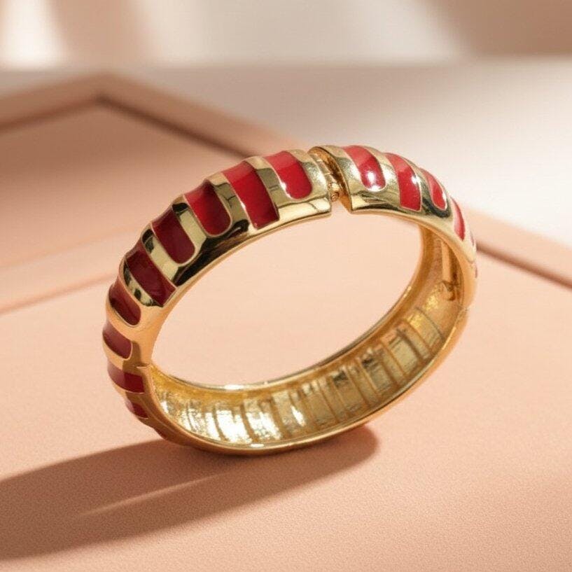 Turn heads with this red and gold enamel bracelet, a bold wide bangle designed for women who love vibrant statement jewelry. Featuring striking red enamel stripes over a polished gold-tone base, this luxury striped bracelet combines timeless elegance with a modern edge.